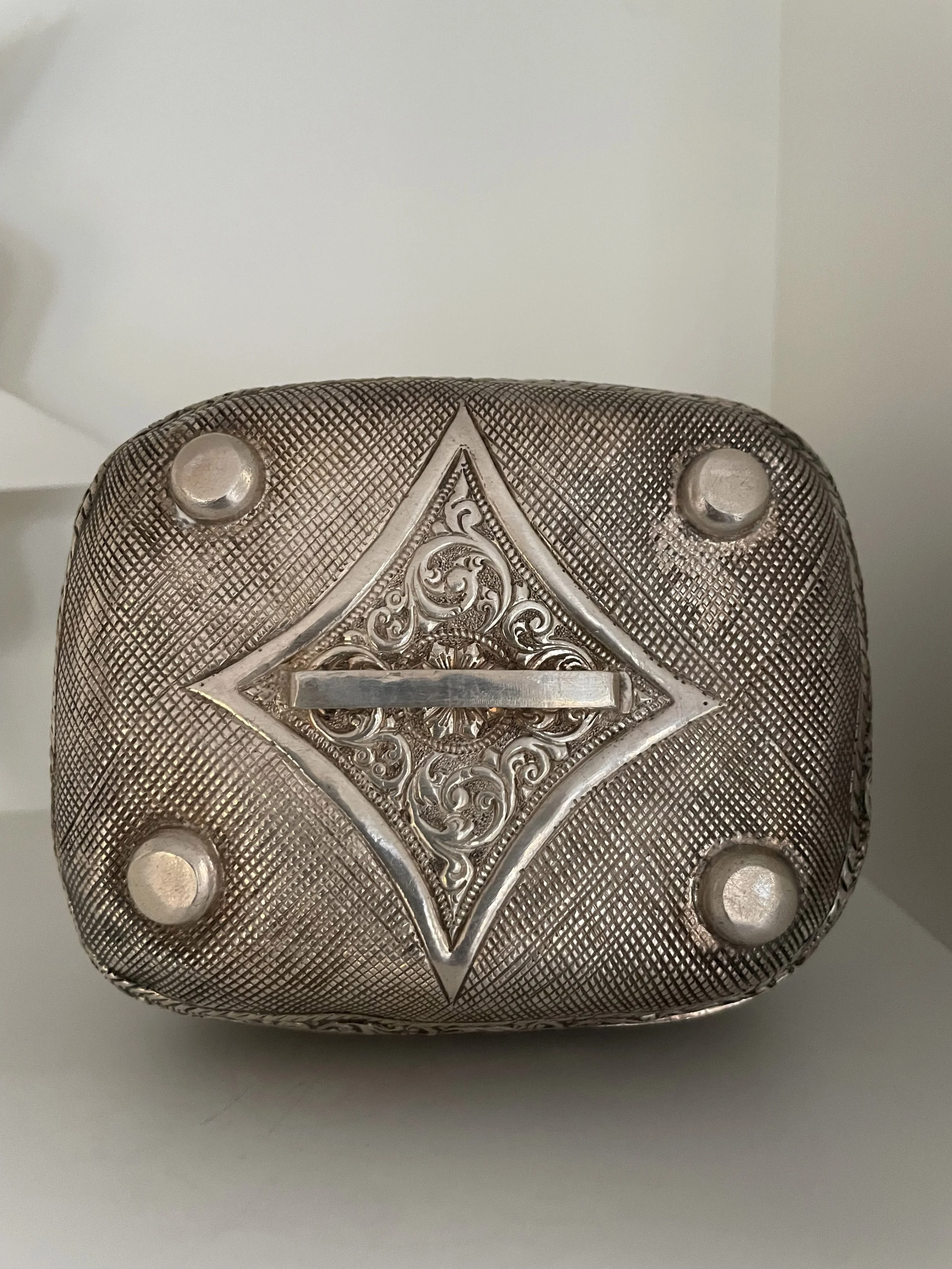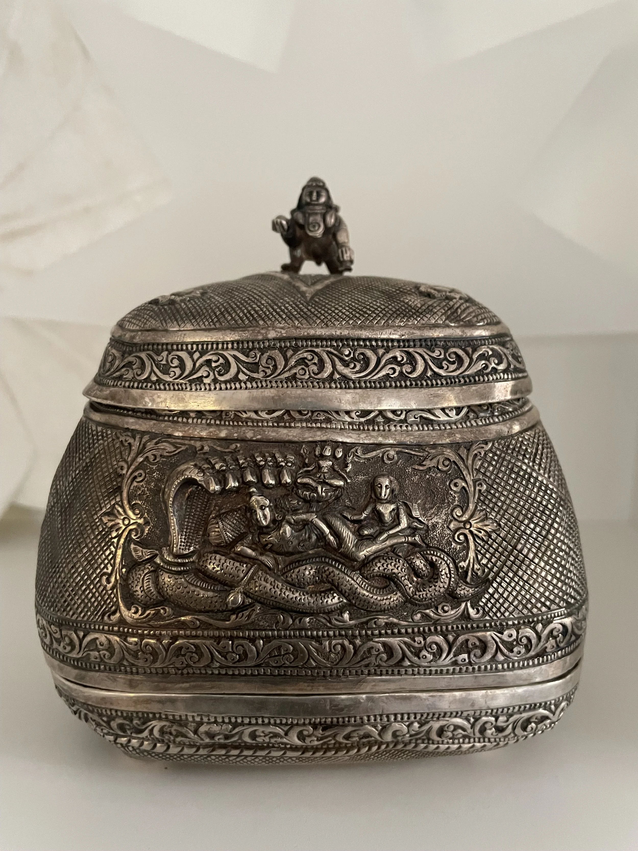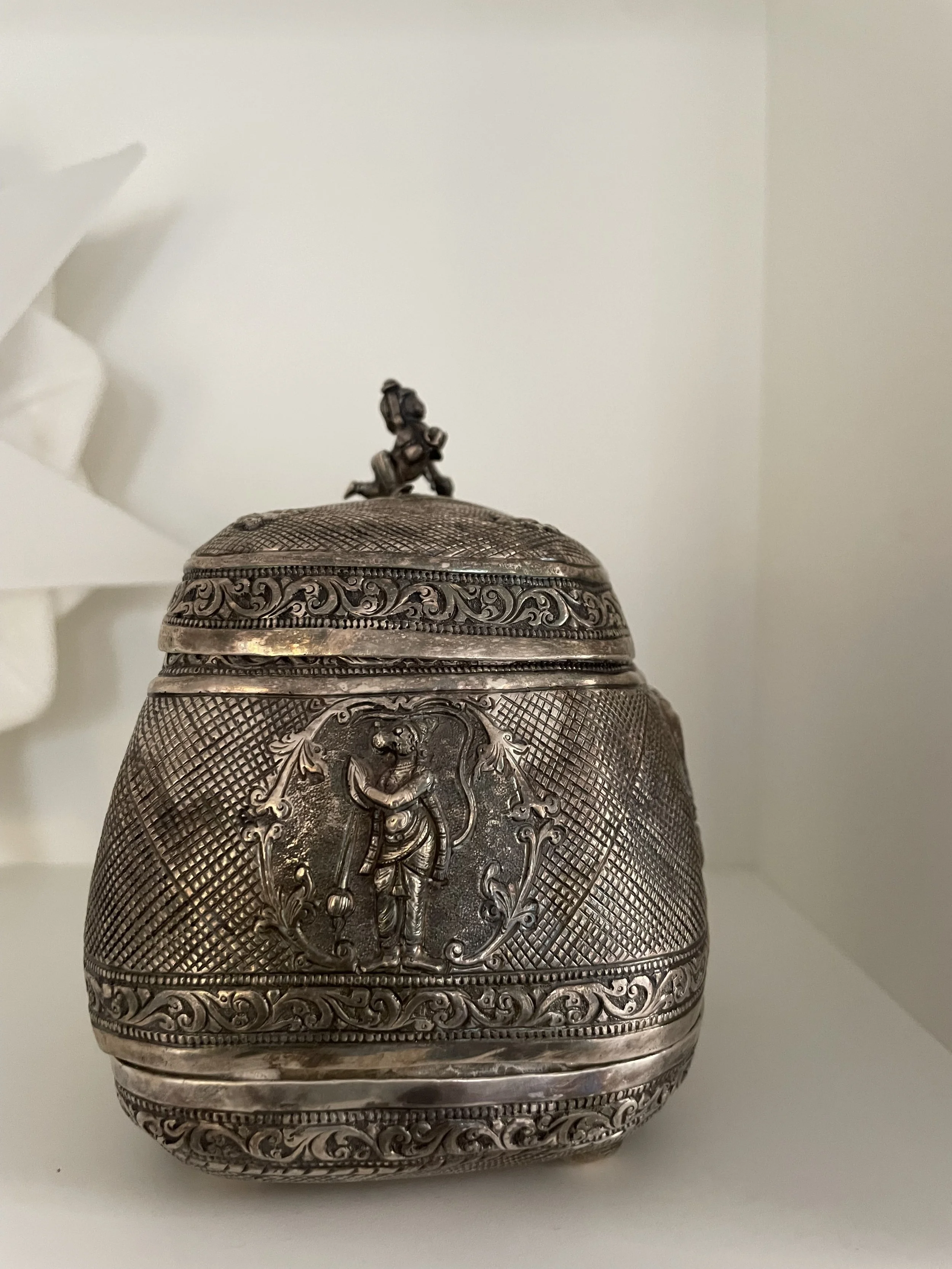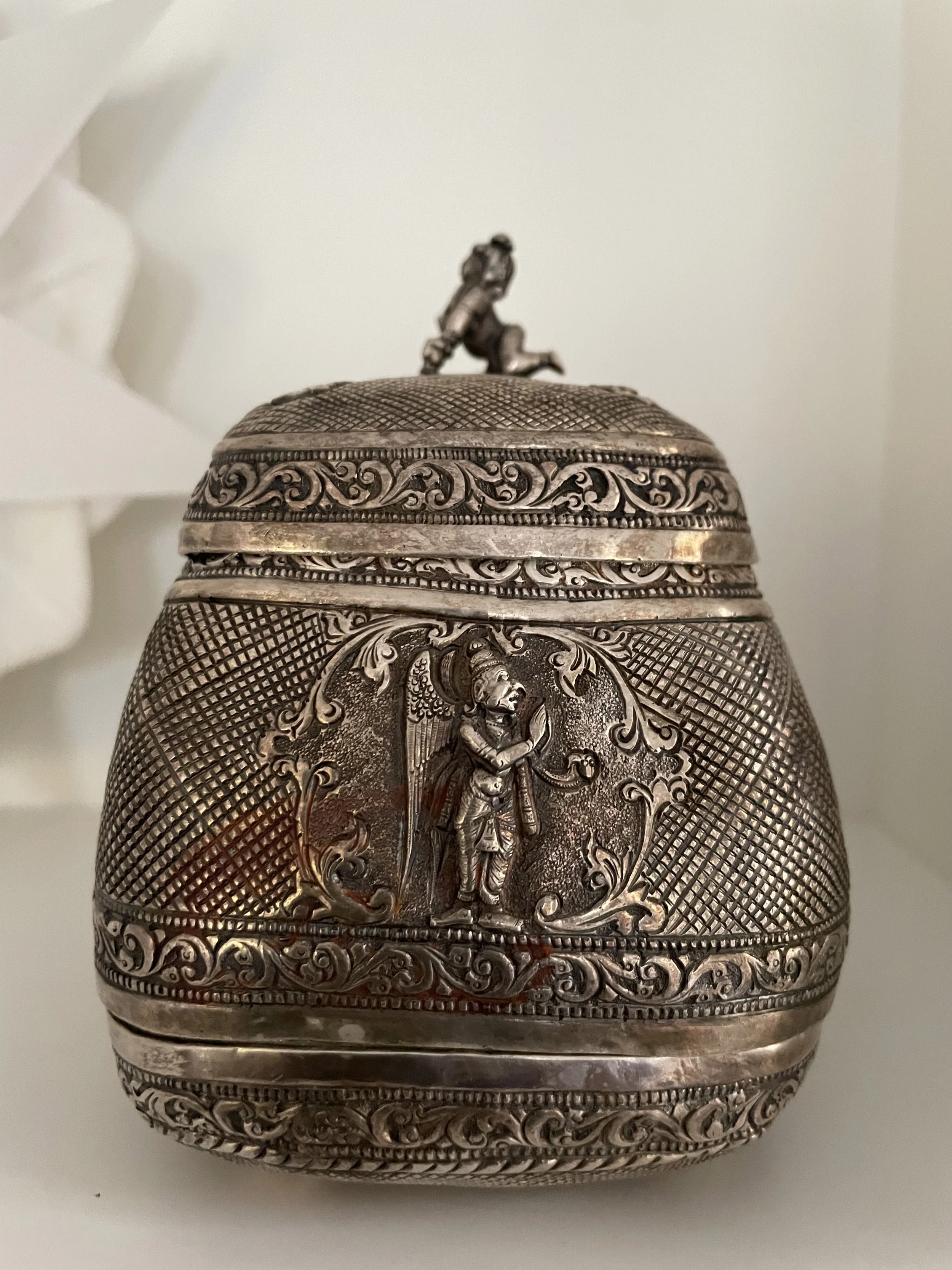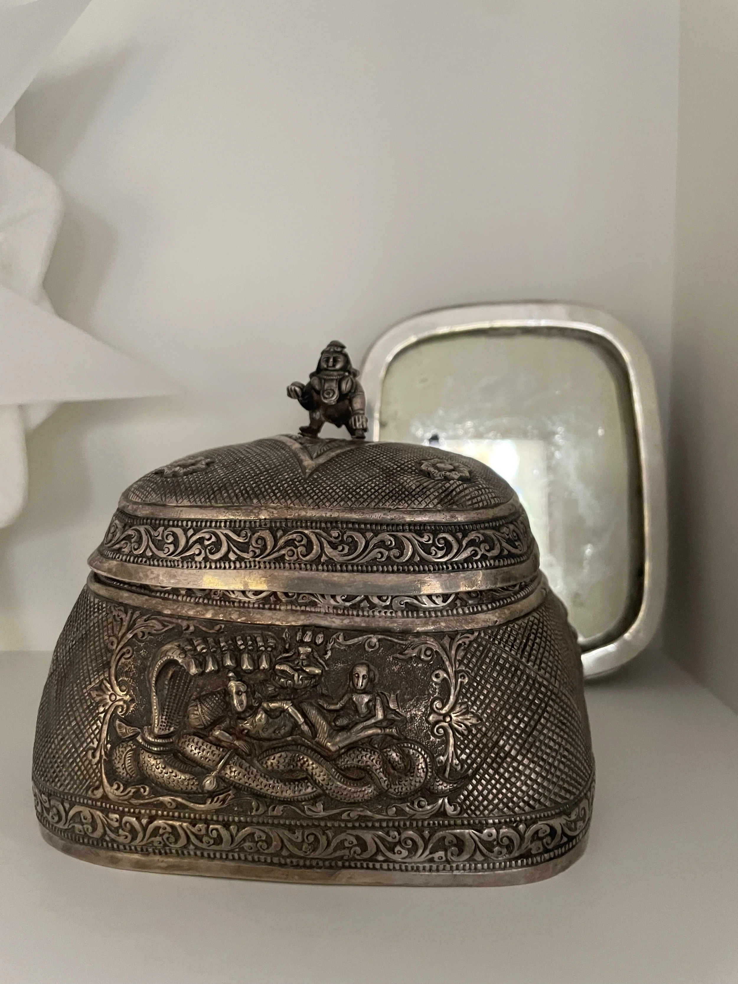 This silver object belonged to my paternal grandmother probably dating back to the early 1900s. It is a “makeup” box that is beautifully decorated like a basket. The bottom part separates and reveals a mirror. The front has a depiction of Lord Vishnu lying on his serpent bed along with goddess Lakshmi near his feet, the back has the markings of Vaishnava tradition along with the conch and discuss, the lid has a small figurine of baby Krishna crawling. One side depicts the picture of Hanuman and the other of Garuda, the eagle vehicle of Lord Vishnu. I remember my grandmother using this box to get ready for the day after her morning bath. There used to be a silver stick which she used to apply a long orangish red vertical line in the middle of her forhead with a powder called “srichurnam”. The she made a paste in her palm with a piece of white clay and made a small white horizontal white line at the bottom of the red line. My grandmother was a frail thin woman who was bent over with age in the last few years of her life. But I’ve heard from my father that she had an inner strength that was unparelled which helped the family survive financial and personal troubles. For me, she is always an affectionate memory who adored everything I did as a child and young woman.