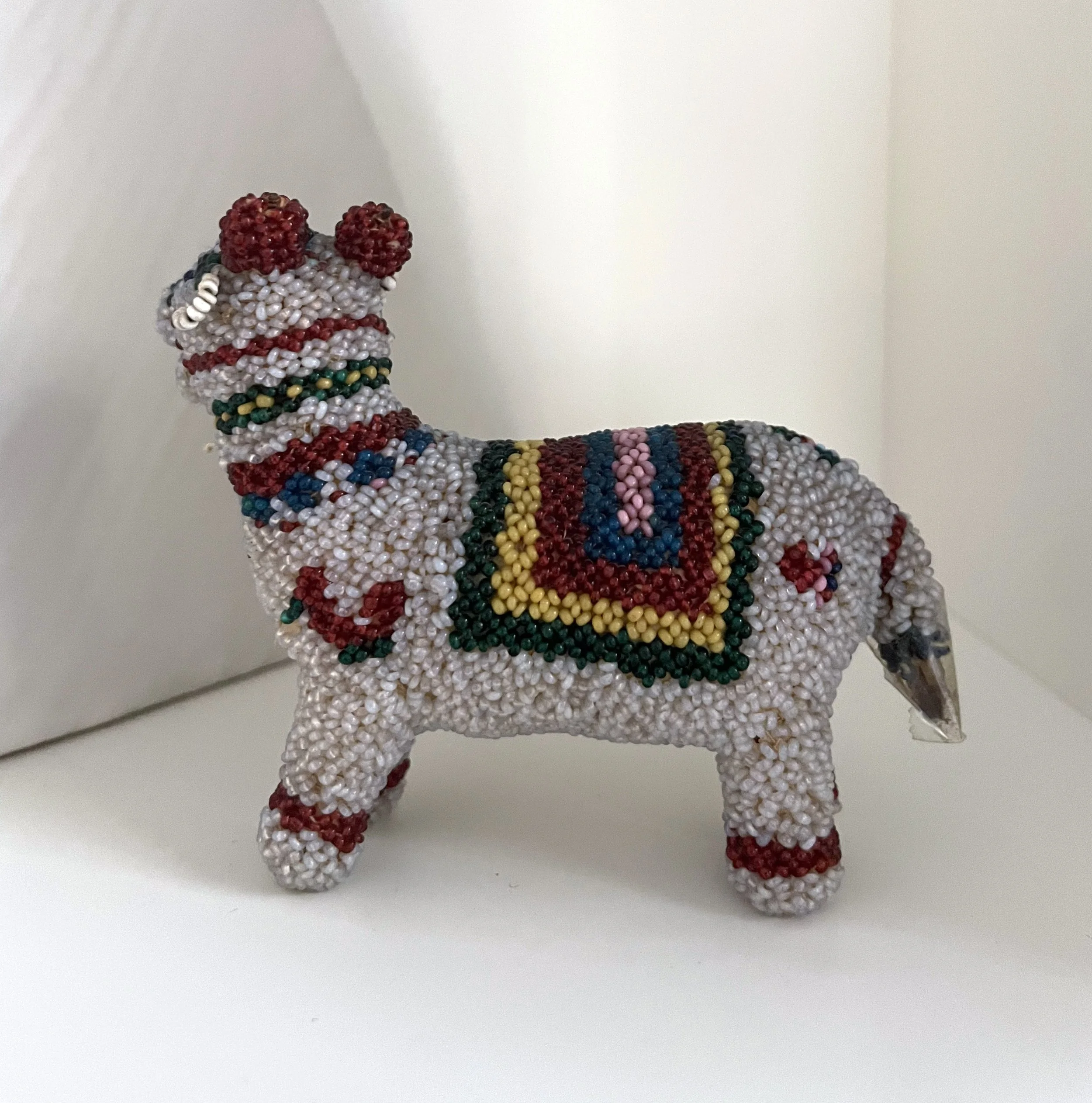 This little beaded object is probably a bull made in the late 1800s by my husband Sharath’s great grandmother. The decorations depicted on the bull might be connected to a holiday like “Sankranti” when cows and bulls are honored for their hard work in the fields in South India. The glass beads are extremely tiny. Sharath never knew his great grandmother but he appreciates the whimsy as well as the care and affection with which it was executed. He imagines her smile when she finished making it. Her personality comes through in this object and part of her lives on.